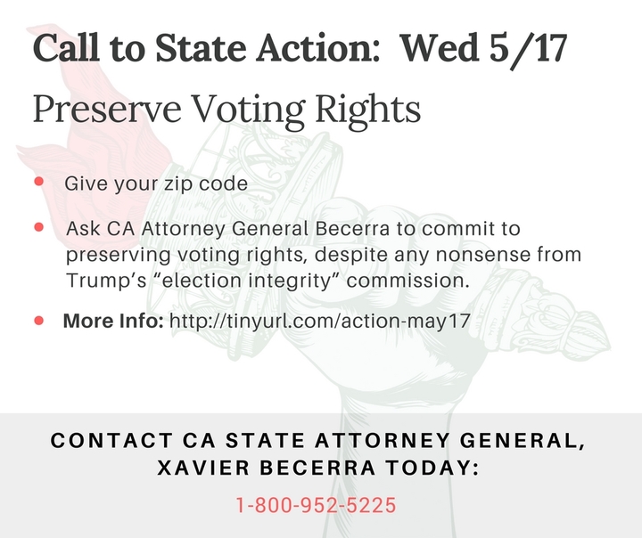 Script: In light of Trump’s newly formed “election integrity” commission, I’m calling to urge California Attorney General Xavier Becerra to commit publicly to preserving voting rights by challenging discriminatory policies, such as voter ID laws, that suppress voting in the name of electoral integrity.