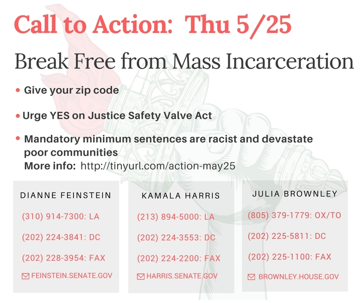 Script: I’m calling today to urge (___) to support the bipartisan Justice Safety Valve Act. Please resist Attorney General Jeff Session’s attempt to double down on mass incarceration.