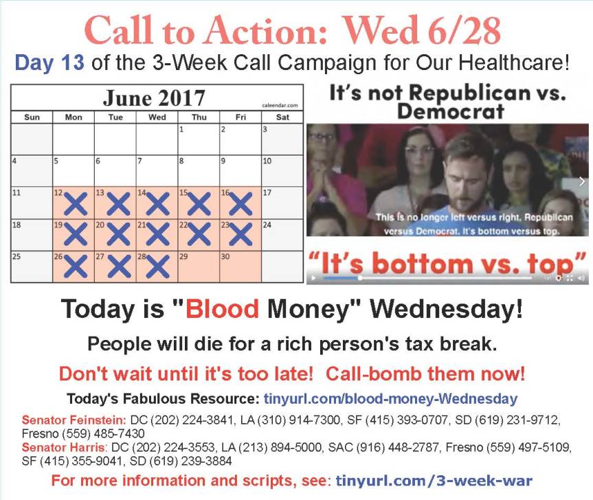 Call your own senators. They are the only ones who will tally your calls and they need the numbers. But there’s nothing to stop you from calling every one of their branch offices, every day. That would be 11 calls a day total for our CA senators.