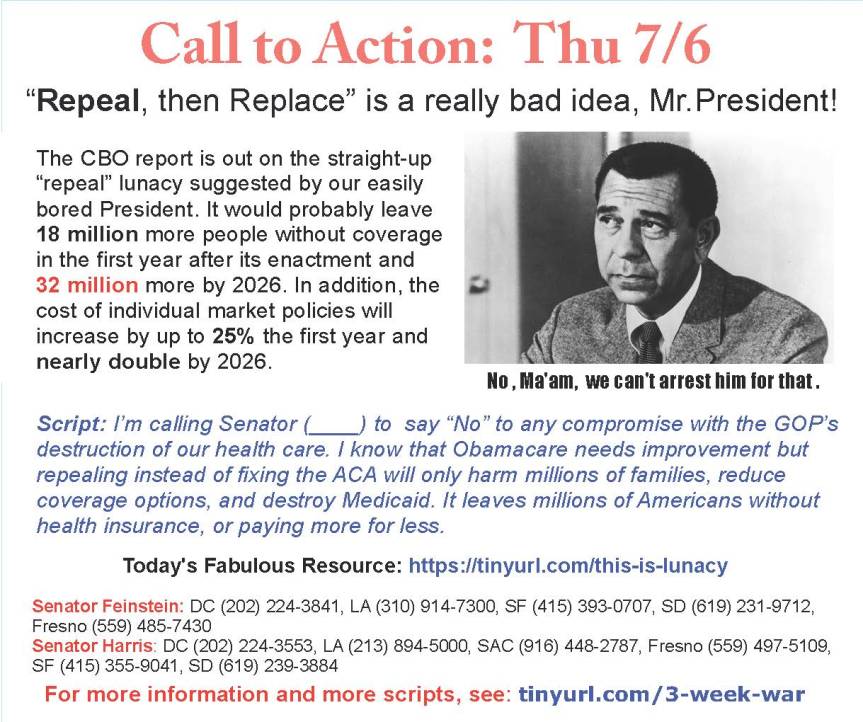 For more scripts, how to call if you hate calling and additional information, see: tinyurl.com/3-week-war