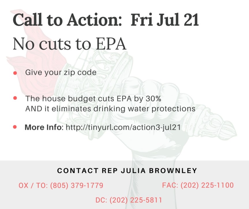 Rep. Julia Brownley: (CA-26): DC (202) 225-5811, Oxnard (805) 379-1779, T.O. (805) 379-1779