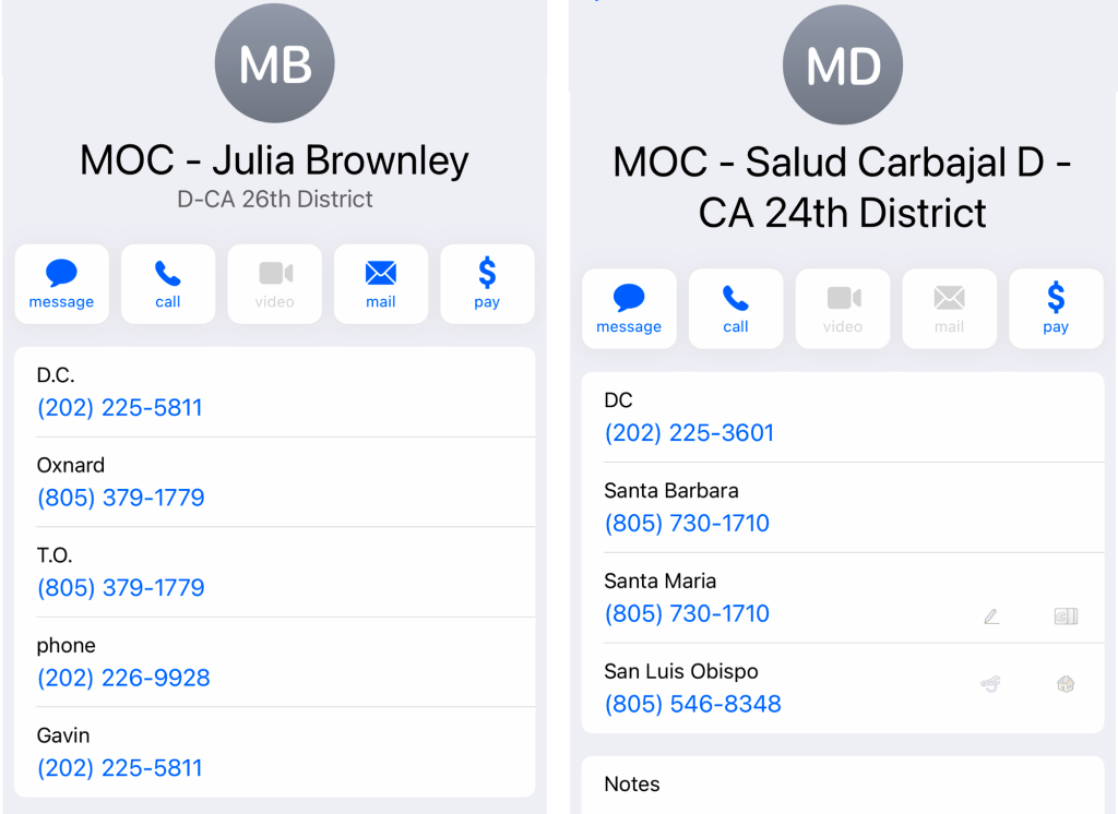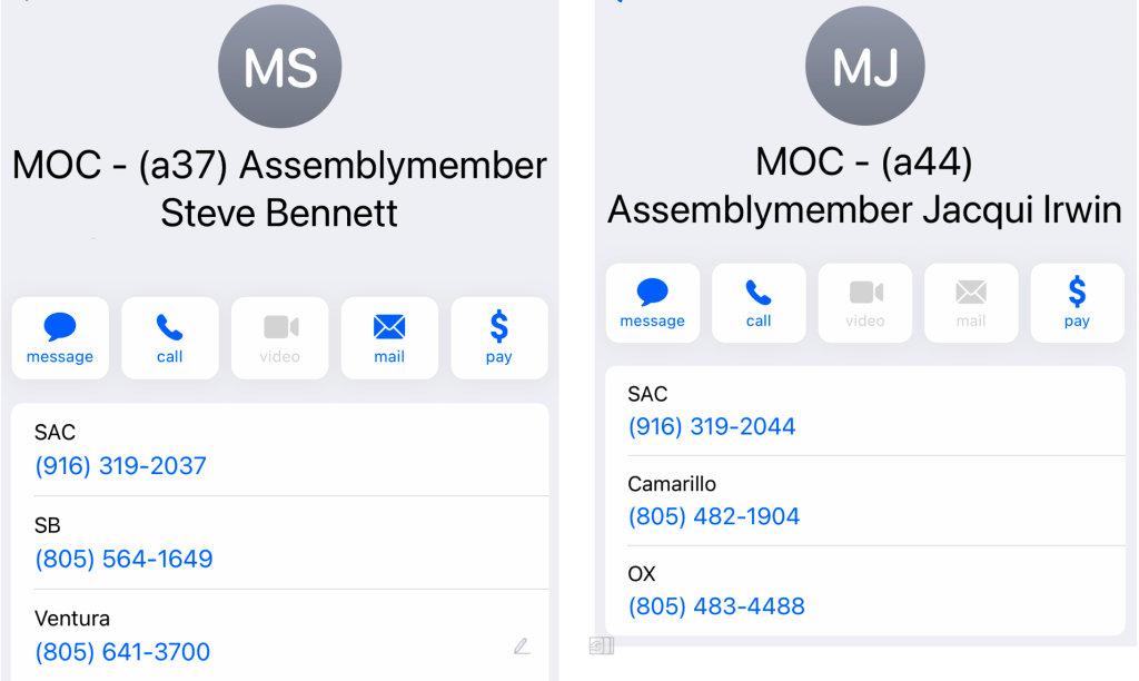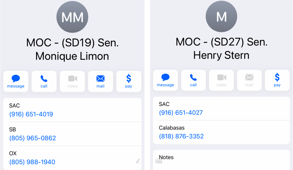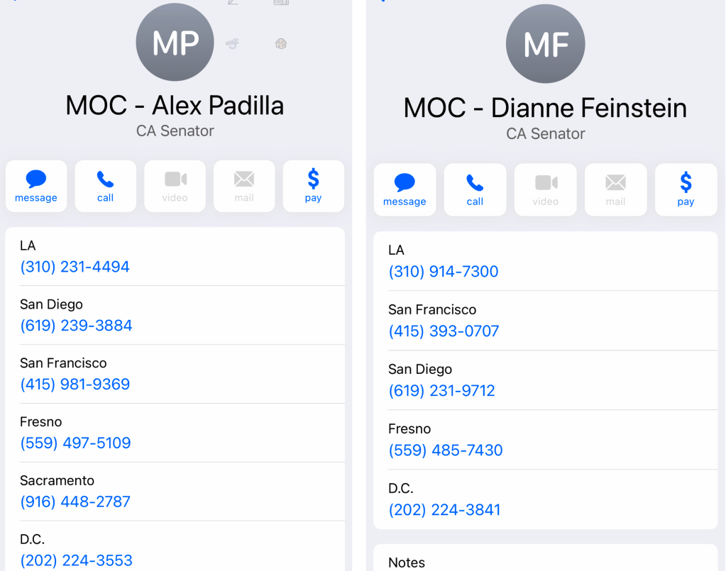 ALL of my politician numbers are together under the MOC heading – (“Members of Congress“), which makes switching between them fast. You can use “PWMMC” (People Who Make Me Crazy”) or anything that makes sense to you. Just put them all in one place.
