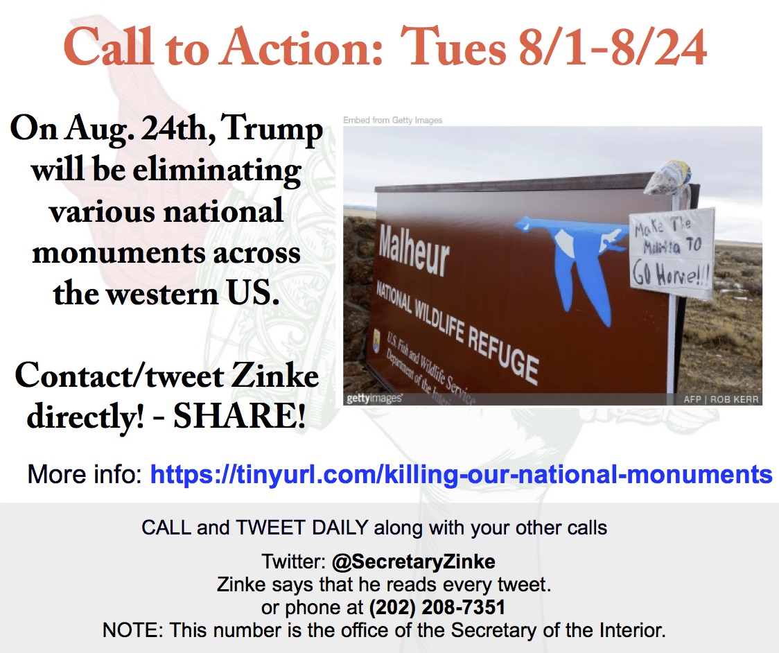 On Aug. 24th, Trump will be eliminating various national monuments across the western US. – Contact/tweet Zinke directly! – SHARE!
