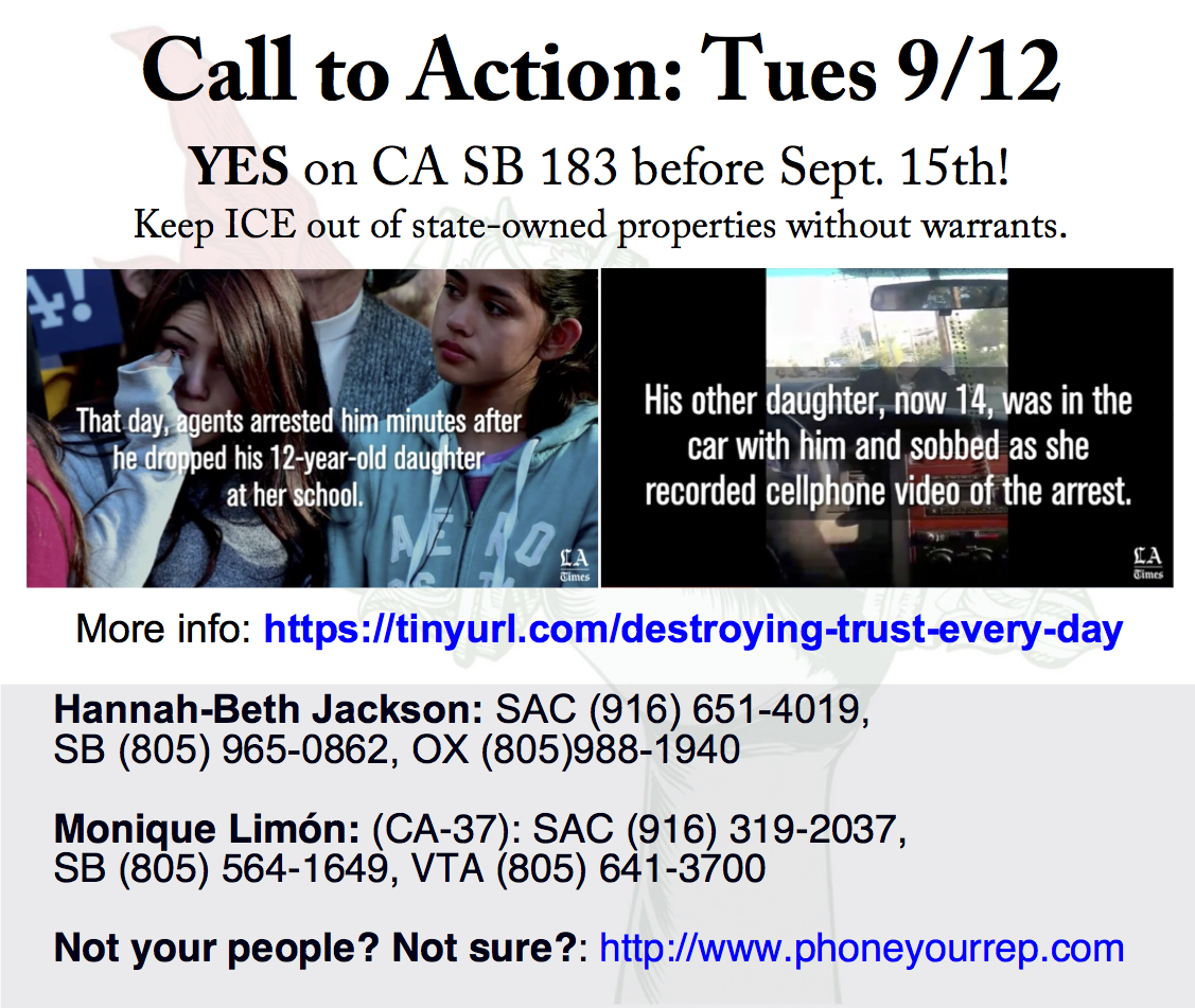 Ask CA legislators to pass SB 183 and keep ICE out of State buildings. Deadline Sept. 15!