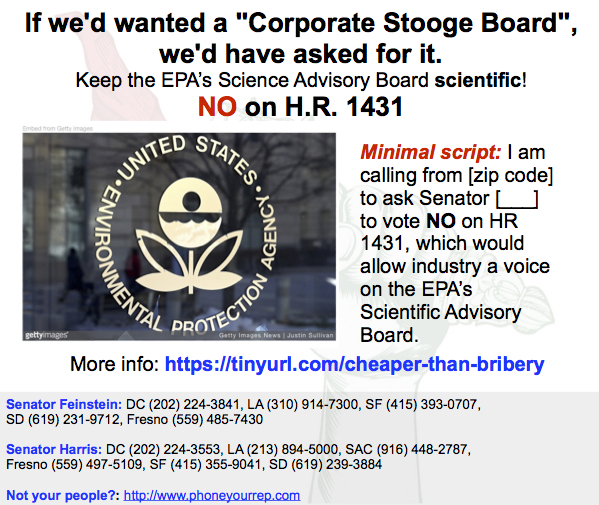 Minimal script: I am calling from [zip code] to ask Senator [___] to vote no on HR 1431, which would allow industry a voice on the EPA’s Scientific Advisory Board.