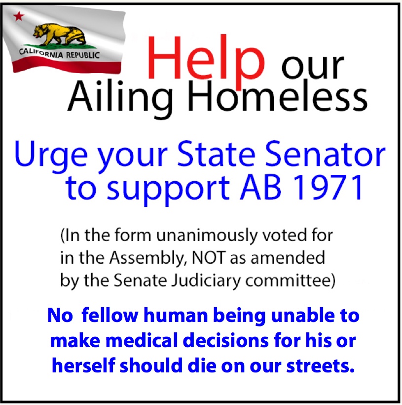 Help our Ailing Homeless – Urge our State Senators to support AB 1971 in its Original Form!