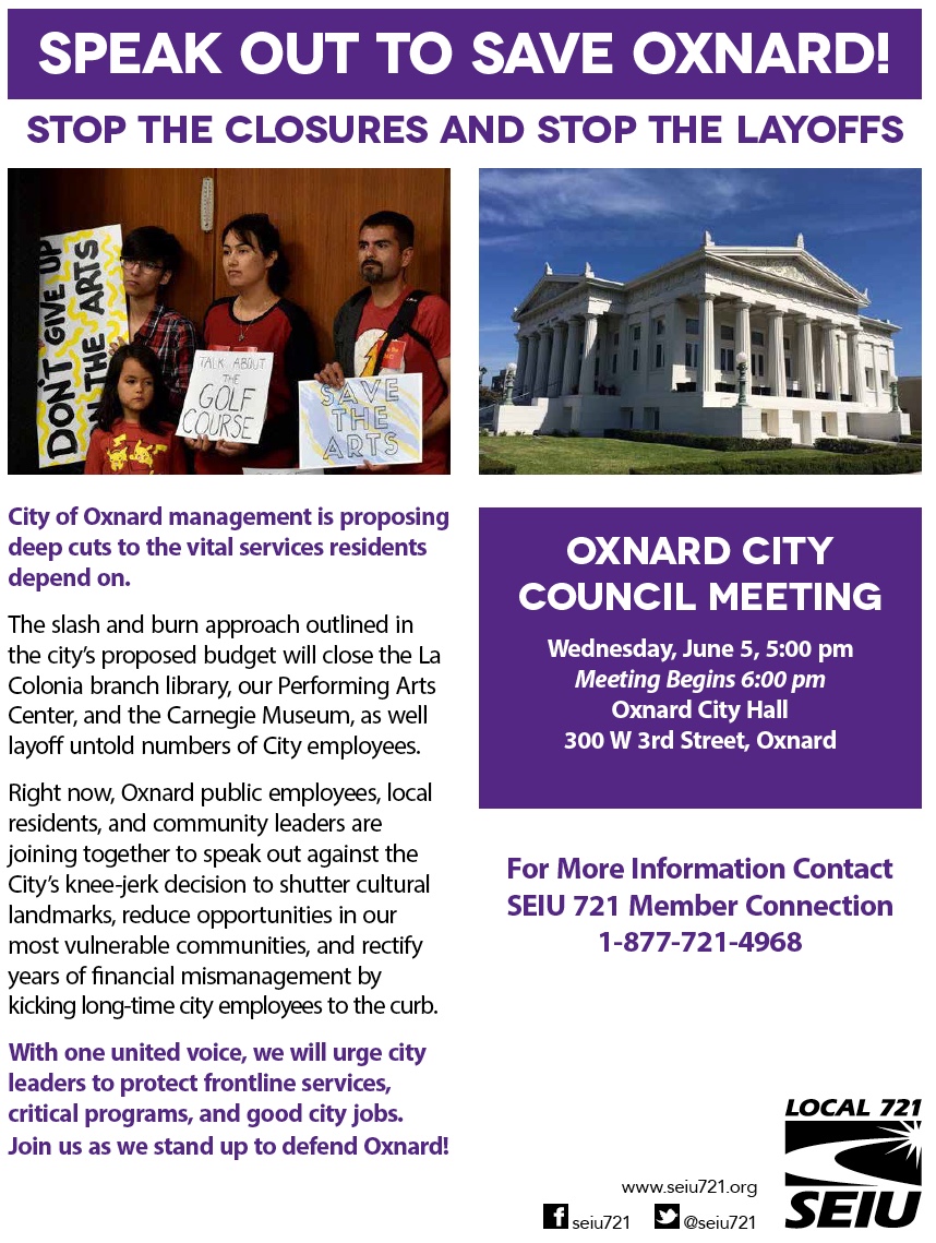 Wed – 6/5: Come join your neighbors tonight! Oxnard’s City Manager and Council needs to hear from you about the proposed budget cuts.