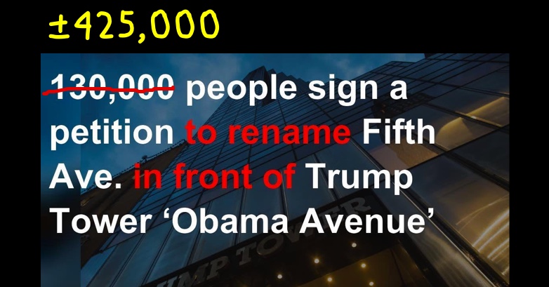 We request the New York City Mayor and City Council do the same by renaming a block of Fifth Avenue after the former president whose many accomplishments include: saving our nation from the Great Recession; serving two completely scandal-free terms in office; and taking out Osama bin Laden, the mastermind behind September 11th, which killed over 3,000 New Yorkers.