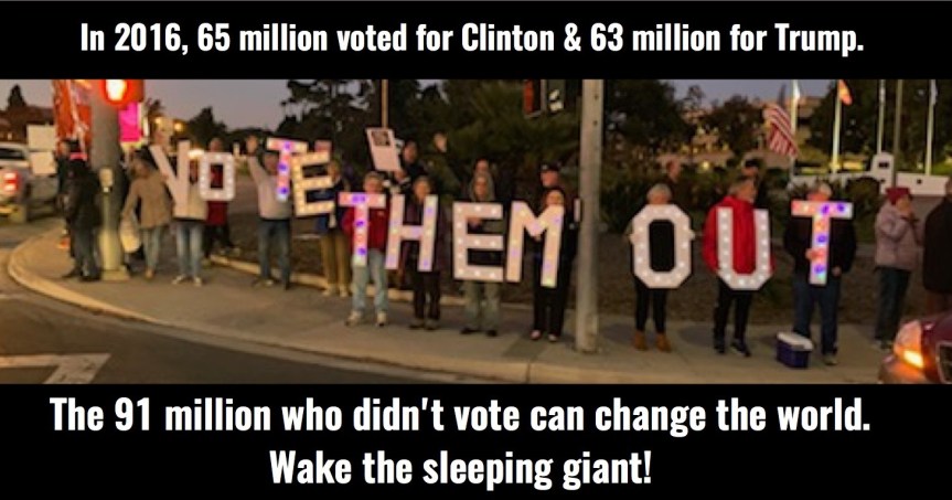 The GOP is a minority party. The only way they can stay in charge of a huge populace who disagrees with their policies is by cheating and voter suppression, including repressive laws and divisive social media campaigns, the latter aided by their Russian allies. The 2016 election was close enough to allow the Electoral College system to take it away from the majority for the second time in the last five elections. We won’t be able to fix the iniquities of this system before the November election, so let’s focus on what we can do. What we need is a landslide. What we need is the 91 million voters. What we need to do is wake the sleeping giant amongst us. Today we are concentrating on just two strategies.