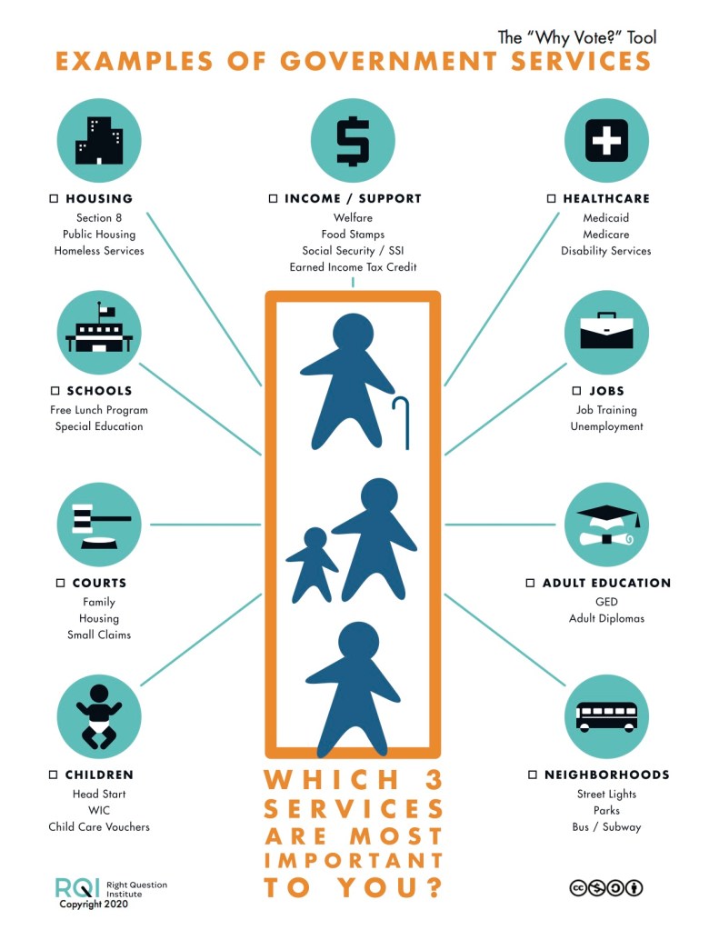 The Right Question Institute (RQI) has created this graphic tool (below) to help non-voters to identify (3) issues that are important to them (resources are available in Spanish, as well.). We’ve included videos from the site to show how basic human problems, like poverty, joblessness, a sick child, or a serious health condition, are very good reasons to vote.