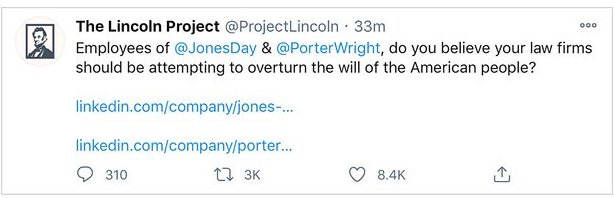 They need to be making their choices soon. (Vanity Post) “The never-Trump Republican Lincoln Project, meanwhile, told the Washington Post, that they intend to launch a half-a-million dollar campaign—with TV and digital ads—targeting Jones Day (as well as their other clients) and Porter Wright for representing the president. “I’d like to know how General Motors justifies working with a company that’s aggressively seeking to undermine the validity of a free and fair democratic election,” Rick Wilson, a Republican strategist and co-founder of the Lincoln Project, told the Post’s Greg Sargent.”