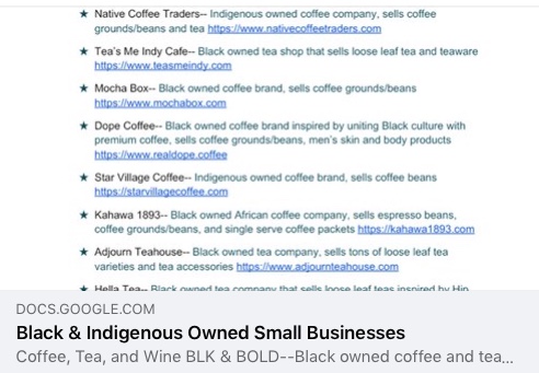 - BLACK & INDIGENOUS BUSINESSES: A Simi Valley woman put together this great list of alternate gift shopping: ”With the socially distant holidays coming up and the need to support small businesses with COVID affecting them, I wanted to make an effort to purchase from Black and Indigenous owned small businesses instead of shopping at big corporations. It took a lot of time to research different businesses, so I just compiled a ton I found into an organized list so that I could share with others who also want to support these businesses but maybe don’t have the time to research them. Especially with the need for not gathering in groups or traveling, it is a great alternative to use for shipping gifts to your friends/family. Disclaimer: I do not take ownership of “discovering” any of these businesses.“
