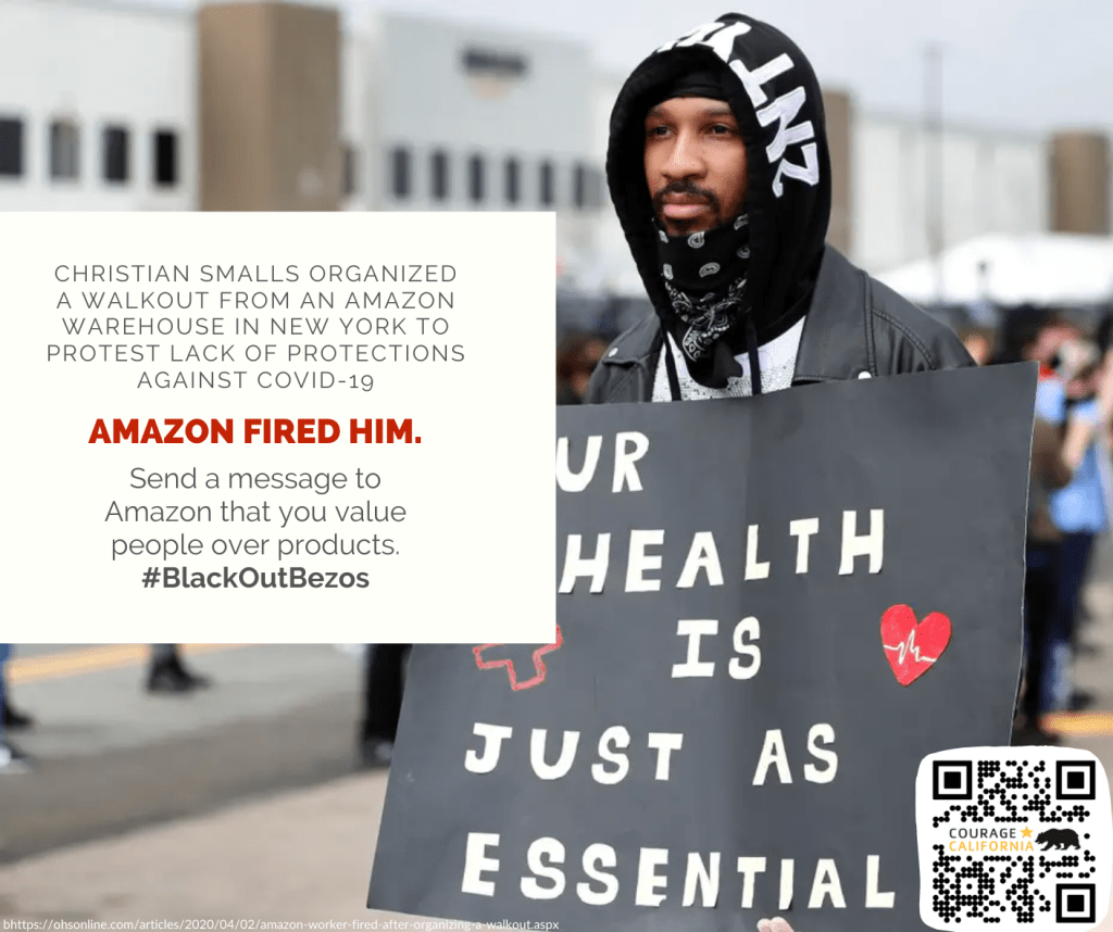 (Courage CA Campaign) “Christian Smalls was working in an Amazon warehouse when the coronavirus pandemic started, and he soon realized that he and his fellow employees were in grave danger. Amazon was not providing PPE or mandating proper social distancing, and a fellow employee died of the virus. He then organized the warehouse workers to demand better health care protections — and Amazon promptly fired him. ..Smalls has filed a class action lawsuit on behalf of the workers, who are mostly Latinx and Black.