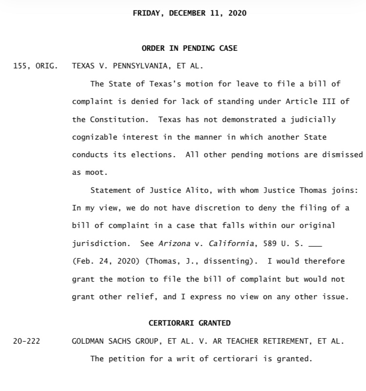 (List of legislators from WaPo and Friday’s last minute additions here. We can’t figure out whether they thought it would take a lot longer for SCOTUS to suss out this nonsense, giving them time to do a lot of posture-y promos for their folks back home, or they decided, hell, they might as well get on Trump’s future “Christmas loyalty list” while they can. (List of attorneys general from brief)