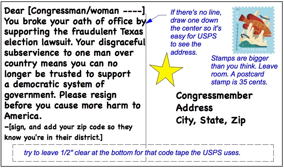 Minimal script for GOP reps and senators who’ve remained silent: I’m calling from [zip code] to tell [Rep./Sen. ___] that I’m ashamed that [he/she] is too cowardly to speak out against this seditious effort to overthrow an American election. I’m asking [Rep./Sen. ___] to publicly take a stand against this lawsuit and acknowledge Biden has won the presidency, or resign now if [he/she] are so frightened by one man, or so greedy to stay in office, that they are willing to destroy our democracy.