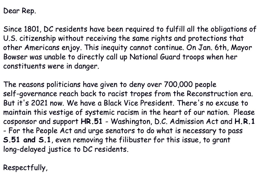 Minimal script: I’m calling from [zip code] to thank Rep./Sen. [___] for being an original cosponsor for the [Rep. – HR.51/ Sen. – S.51] – Washington, D.C. Admission Act. I’m also requesting the Rep./Sen.[___] cosponsor [Rep. – H.R.1/Sen. S.1] – For the People Act of 2021, which includes support for DC statehood.