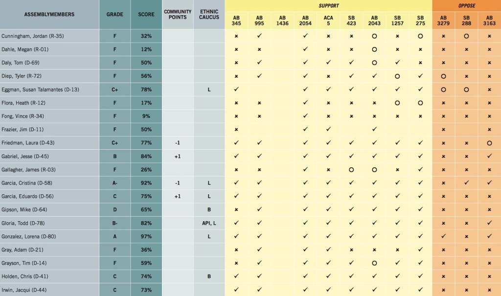 “CEJA’s EJ Scorecard is an attempt to evaluate— comprehensively and fairly — every California legislator and their performance on environmental justice issues. Votes alone, however, cannot capture the entirety of a representative’s contribution (or disruption) to the environmental justice movement. To that end, this year we included Community Points in our evaluation. Each of CEJA’s 10 member and partner organizations were given the opportunity to award up to three bonus points to legislators who significantlycontributed to California’s environmental justice movement by upholding our Environmental Justice Principles. The member and partner organizations were also allowed to subtract up to three points from legislators who showed a disappointing lack of commitment to those principles. Examples of ways legislators showed a commitment to these principles include (but are not limited to) engaging in environmental justice-focused town halls, entering into a respectful dialogue with environmental justice community leaders, trusting local expertise, and attending tours of environmental justice communities. Examples of ways legislators did not show a commitment to these principles, and for which they earned negative Community Points, include (but are not limited to) being inaccessible to community members, sponsoring or strongly supporting legislation that CEJA opposed, or taking no action when their constituents faced strong injustices.