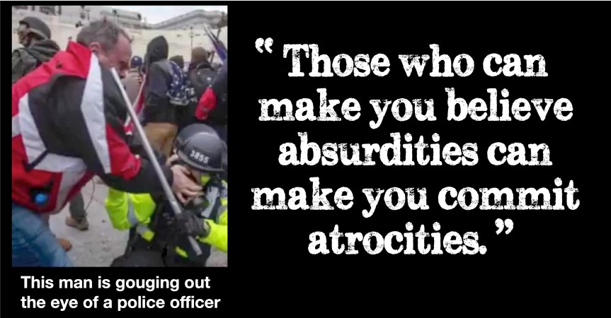Every one who stepped through the door should be charged with §5104- Unlawful activities & 18 U.S. Code § 1752, with the potential punishment of a year in prison. Many would be resolved with a good-sized fine, along with a ban prohibiting gun possession, which is a great deterrent as well. Break the “Big Lie” spell with consequences.
