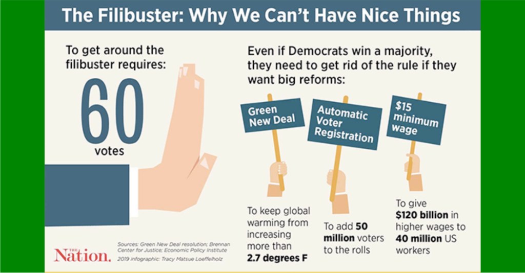 We have less than 2 years before the next election and we have a lot to fix NOW! The GOP will use the 60-vote minimum of the filibuster to block progressive legislation from advancing in the Senate, keeping that chamber’s reputation as “the most powerful force for structural racism in American life.” (Great filibuster explainer video at the bottom of post.)