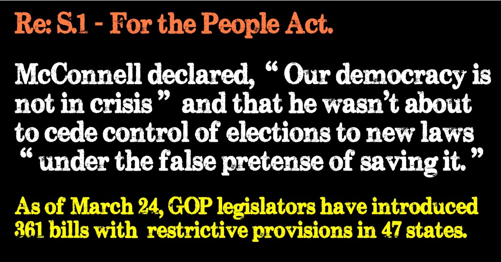 Last week we heard Heritage Action, the lobbying arm of the Heritage Foundation, explaining (on tape) the way they had been drafting the voter suppression laws Republican legislatures have been enacting nationwide with great speed.² 361 bills with restrictive provisions had been introduced in 47 states, as of March 24, 2021, and some have begun to be enacted. These laws affect voters of color, young voters and poor voters. They are not done. Heritage Action has announced plans to spend upwards of $24 million pushing voter suppression legislation in key swing states before the 2022 elections.