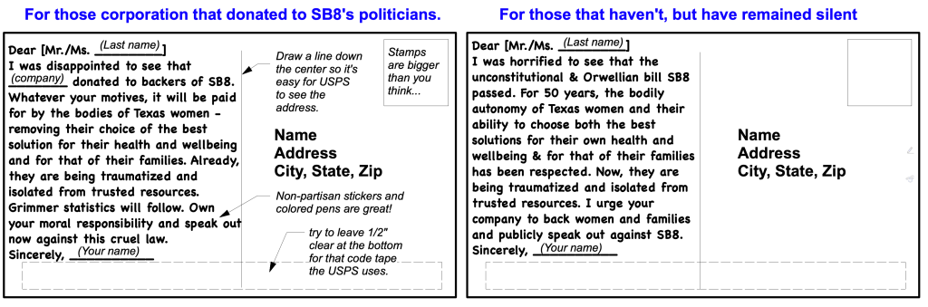 UltraViolet created a great list of Texas-based companies with national profiles, some of which have even donated to the Texas politicans who sponsored SB8! Yesterday, 50 corporations signed on to a letter protesting SB8, but there’s seems to be no overlap with Ultraviolet’s list. You can write Ultraviolet’s silent CEOs full-on letters, or stay short and sweet with a postcard-sized demand to know what actions they’ve taken to protect the bodily autonomy of the women in their state. Or send some to your legislators if they’re not cosponsors of either of the above bills.