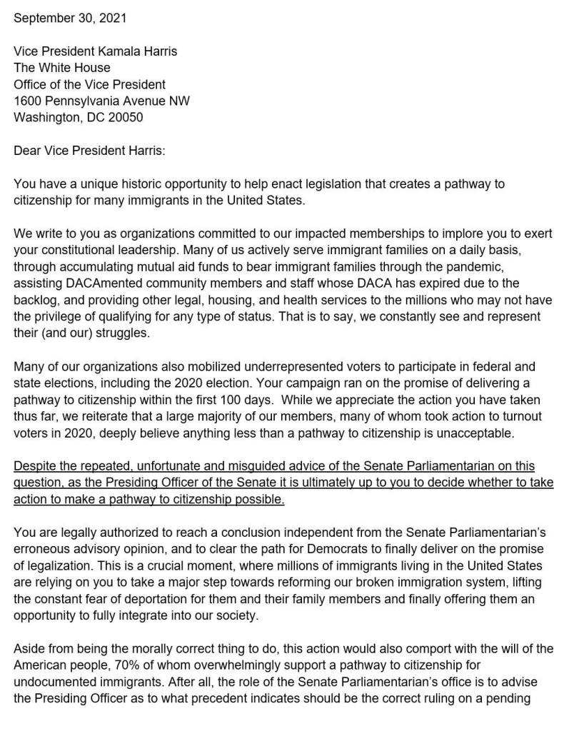 This letter was deliverted to Vice President Kamala Harris by immigrant organizations with impacted memberships. The letter was signed by groups including NAKASEC Action Fund, CASA in Action, CPD Action, Coalition for Humane Immigrant Rights, Make the Road New York and FIRM Action. It illuminates the ease with which Vice President Kamala Harris can disregard the parliamentarian’s advice — and the urgency with which she must.