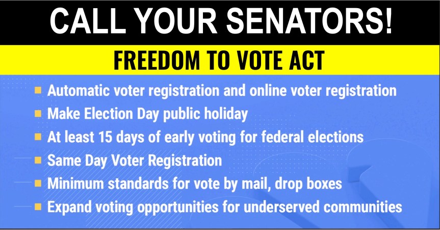 The Freedom to Vote Act (S.2747) has replaced the “For the People Act” in the Senate. This bill, which is backed by Stacey Abrams of Fair Fight, makes Election Day a holiday, ends gerrymandering, combats the anti-voting laws working their way through state legislatures, requires states to allow 15 days of early voting (including 2 weekends), massively expands voting access through automatic voter registration and Election Day registration, increase election security by creating a national standard for voter verified paper ballots, implement a national voter ID standard with reasonable alternatives like utility bills or bank statements, requires voting machines be made in the United States, protect nonpartisan election officials from partisan interference, shines a light on dark money, and makes it harder for billionaires and special interests to buy elections. It’s a good start and and Manchin’s reputation, and the future of the filibuster, is also on the line.
