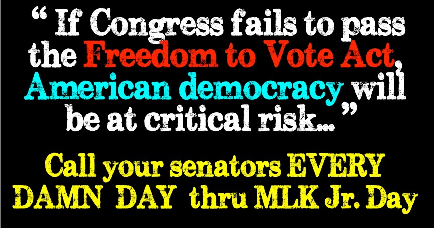 Senate Majority Leader Chuck Schumer is using Martin Luther King, Jr. Day as D-Day for democracy, a war against an opposition that’s already on our own shores, and even embedded within our own party. (His letter here.) Please, call your senators every day, especially those of us with reluctant ones, like Feinstein.