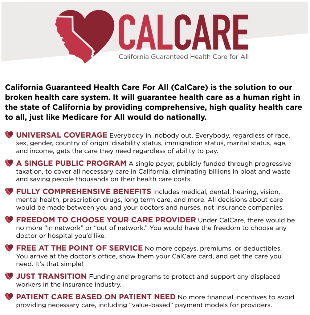 California Guaranteed Health Care for All Act (CalCare) – A bold, public-funded, “cradle-to-grave, head-to-toe” healthcare reform bill to replace the commercial, for-profit-only healthcare system and take control of healthcare away from companies like Pacifica Companies and political lobbyists like the California Association for Health Facilities (CAHF).