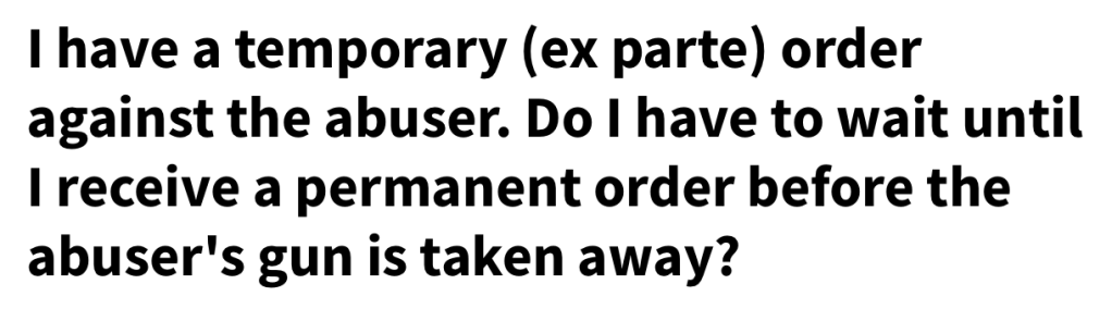 Domestic Violence protective orders can be issued after notice and a hearing, or they can be issued in emergency circumstances without a full hearing involving the respondent (ex parte means “one party). According to a lesser known clause of the Lautenberg Amendment, federal law mandates that gun restrictions apply ONLY after a full hearing, where both parties are heard, giving the suspected abuser the opportunity to contest claims that they pose a theat. However, many states already require or authorize courts to prohibit the possession or purchase of firearms by people subject to emergency ex parte orders when a judge believes that the abuser presents a clear and present danger of violence. In CA, these orders can apply to a number of situations, including domestic abuse and stalking.