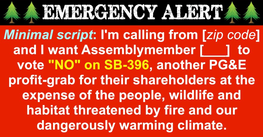 Minimal call script: I’m calling from [zip code] and I want Assemblymember [___] to vote “NO” on SB-396, another PG&E profit-grab for their shareholders at the expense of the people, wildlife and habitat threatened by fire and our dangerously warming climate.