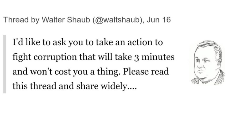 The tweet thread is from Walter Shaub, who we respect the hell out of: “This may seem like a small thing, but it will take you no time at all, and it’s one way that you can make a difference in the fight against corruption. I really hope you’ll do this. And I hope you’ll recruit others. Together, we can have an impact.“
