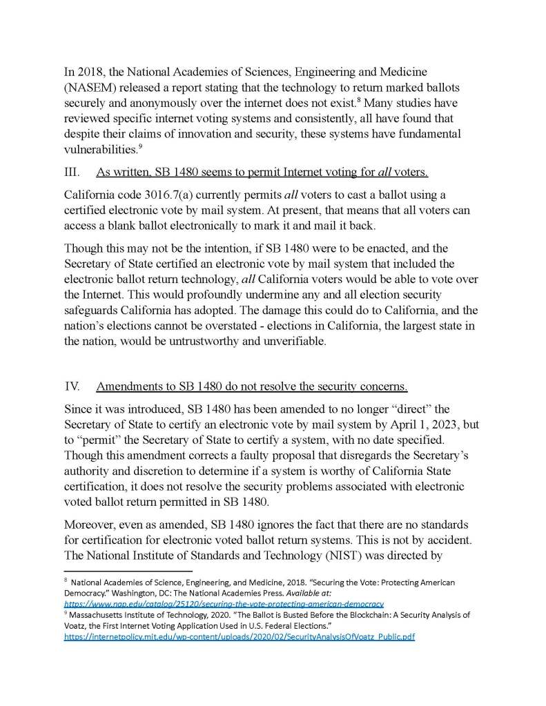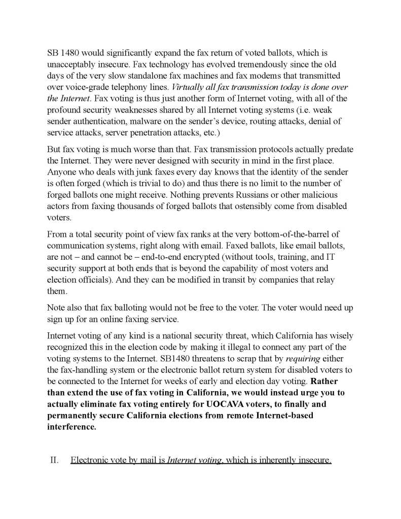 Ten years ago, tech-savvy California banned internet voting, understanding that it could not, by its very nature, ever be completely secure. SB-1480 proposes to allow voters with disabilities to fax in their votes, obscuring the issue that a “fax” now travels by internet, not by the phonelines of decades ago. This is therefore an internet voting bill, which would create dangerous, and currently unsolvable security vulnerabilities, and will remain insecure for the foreseeable future, all while public confidence in our elections is under attack.
