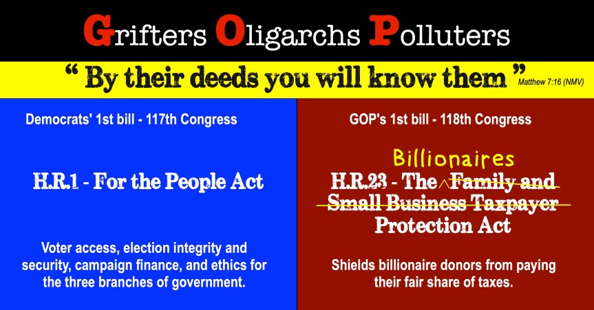 - H.R.23 – Family and Small Business Protection Bill: They are selling this with an anti-government, fear-based campaign (A “SHADOW ARMY” with “AK-15s” and “trained to kill Americans” is “ready to shoot some small business person in Iowa.”) They all should be ashamed. What it will actually do is harm those mentioned in its title, protect the top 1% from audits and create $114 billion increase in deficits over the next decade.