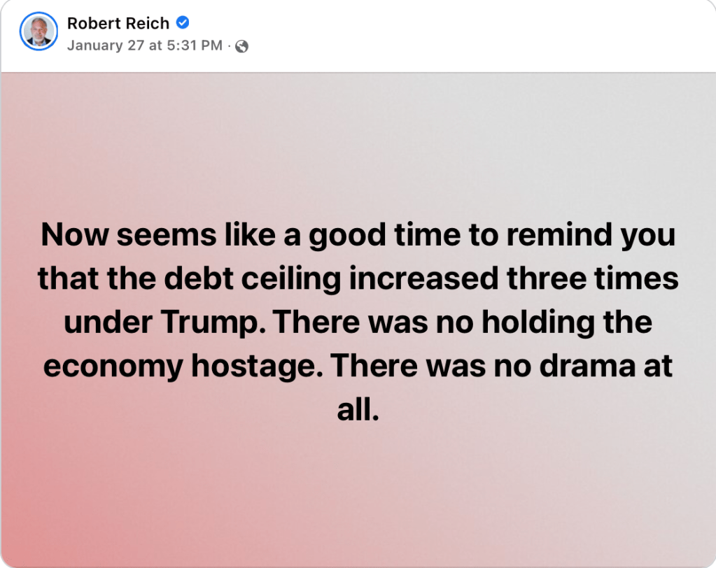 House Republicans are refusing a clean debt limit increase, regardless of the consequences of the U.S. defaulting on its debt. In fact, their new rules package deliberately removed a rule that automatically increased the debt limit to pay what we already owe. They also made rules to protect their rich and corporate donors from paying their fair share in taxes.