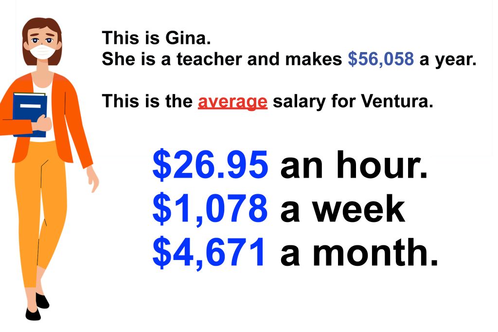 - As of Mar 23 the average annual salary in Ventura is $56,058. Just in case you need a simple salary calculator, that works out to be approximately $26.95 an hour. This is equivalent of $1,078 a week or $4,671 a month. Most salaries in Ventura range between $39,196 (25th percentile) to $71,037 (75th percentile) annually.