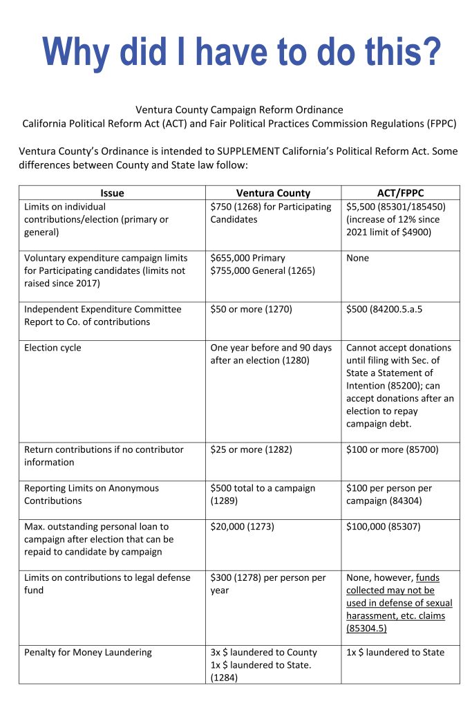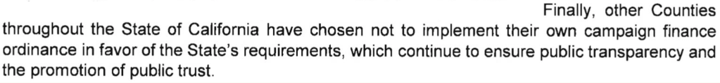 This issue raised by changeling Gorell at the March 14 meeting wasn’t dealt with until the end of the March 28th second hearing. “Supervisor Vianey Lopez of Oxnard asked County Counsel Tiffany North if the county’s current campaign finance ordinance is constitutional. North said the county campaign limits have not been found to be unconstitutional and have not been successfully challenged. North said the county campaign ruled could be successfully defended. North also said the current campaign rules have been amended several times since they were adopted in 2003.“