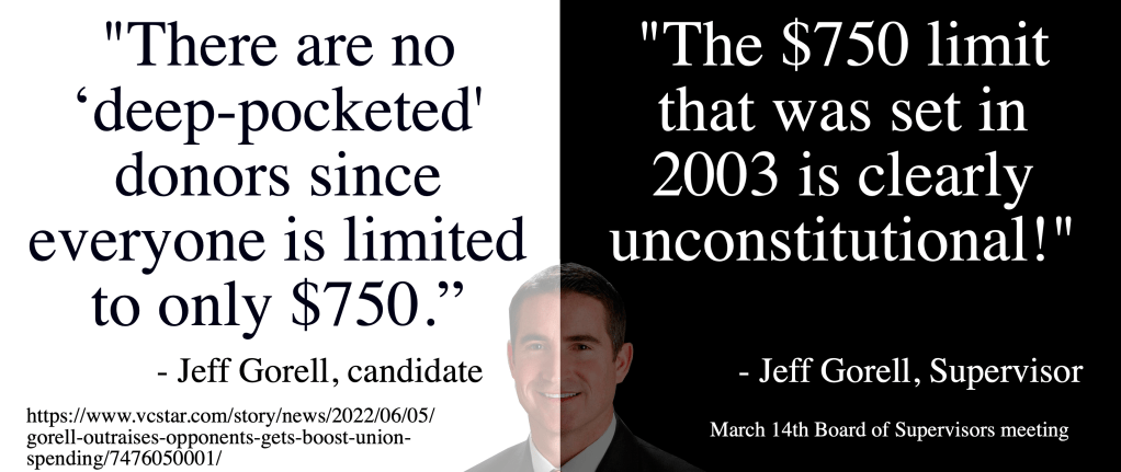 - Now-Supervisor Gorell quoted Buckley v. Valeo to the audience and stated that a $750 limit was UNCONSTITUTIONAL. (See March 14 video below, ±4:10)