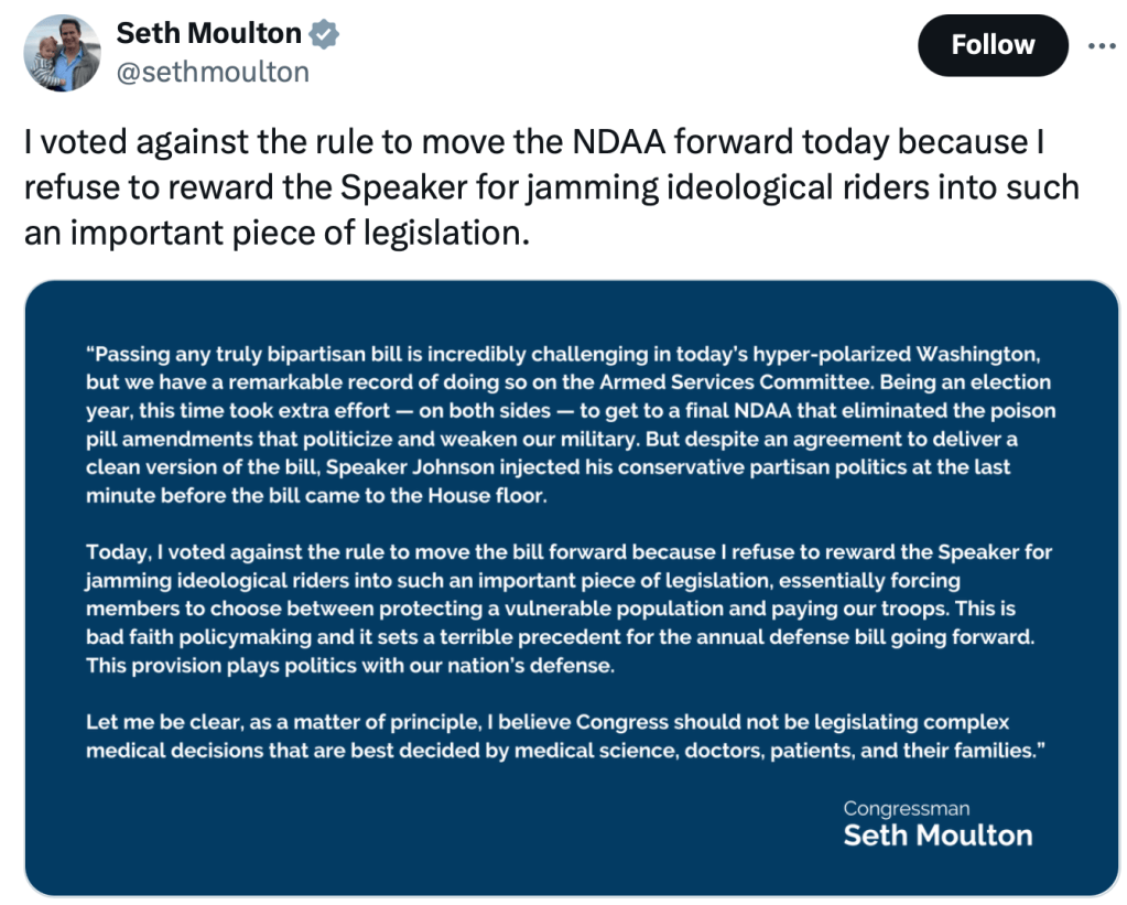 “As I said a few days ago, blanketly denying health care to people who need it—just because of a biased notion against transgender people—is wrong. The inclusion of this harmful provision puts the lives of children at risk and may force thousands of service members to make the choice of continuing their military service or leaving to ensure their child can get the health care they need. For that reason, I will oppose final passage of the FY25 NDAA in its current form.