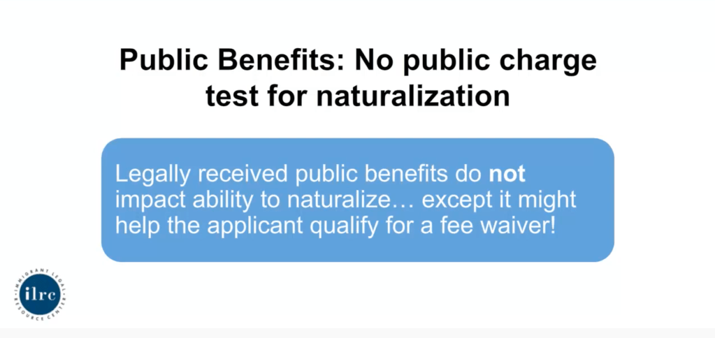 - Public charge is NOT a red flag. An worried applicant may ask about this. However, any benefit that the individual received legally has no effect on naturalization. On the contrary, it can help an applicant qualify for a fee waiver.