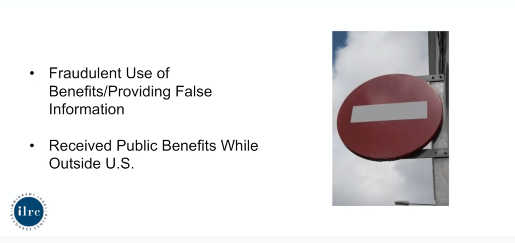 - There is a very narrow public charge ground of deportability but IRLC has never seen it used. It involves failure to pay after a government agency demands repayment of a cash benefit in the first five years a person had their green card.