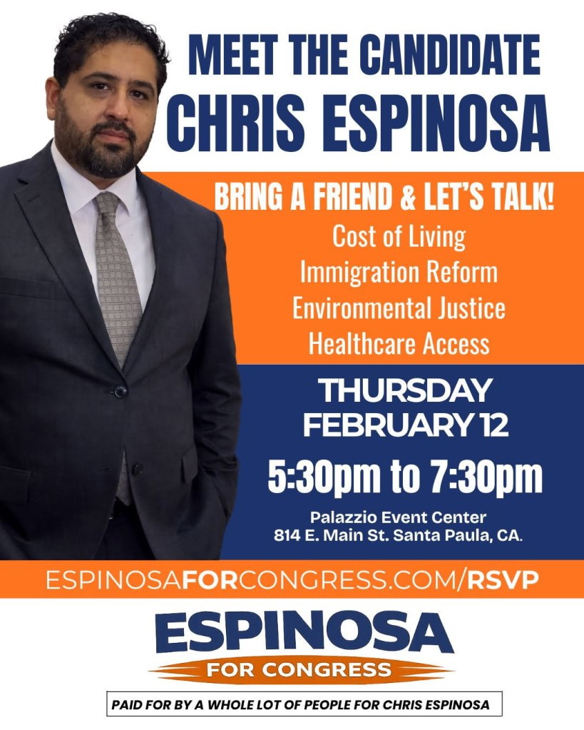 THURSDAY – 02/12/26 – SANTA PAULA – Meet Candidate Chris Espinosa (5:30 – 7:30 pm)