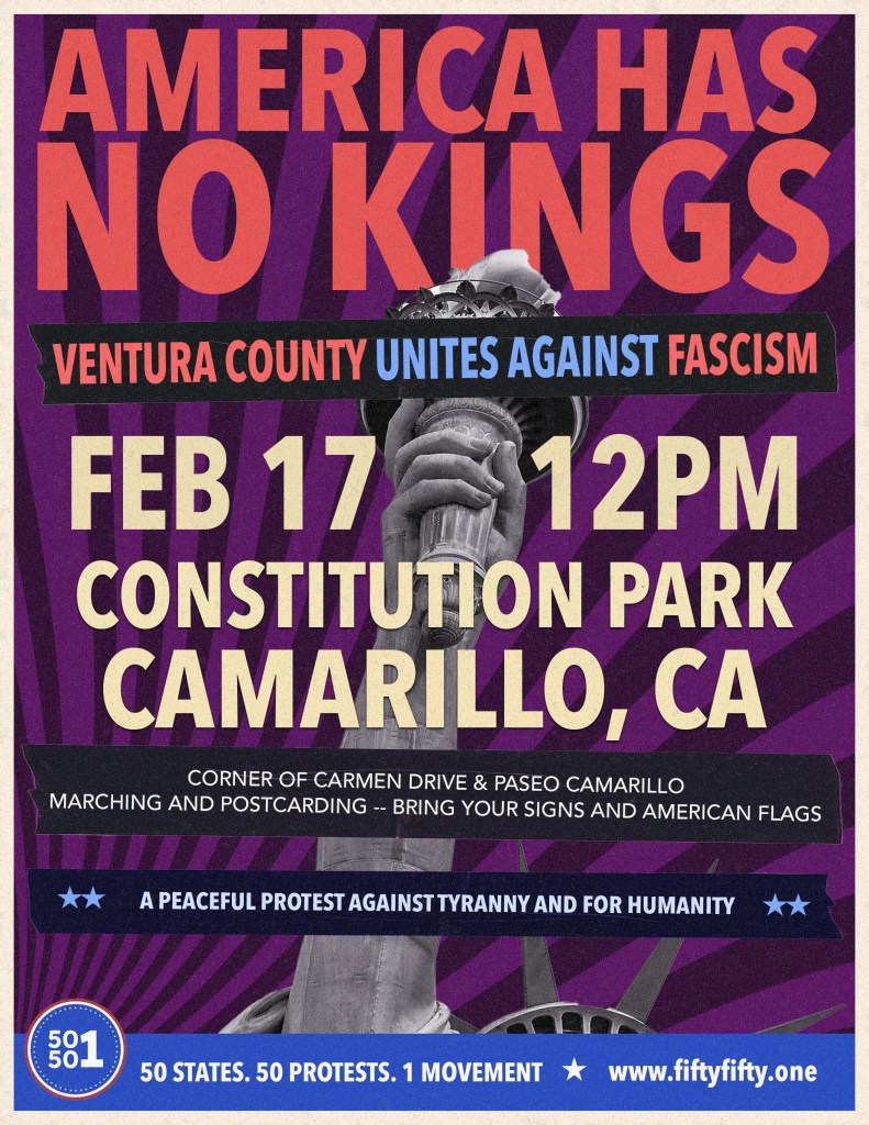 Monday – 02/17/2025 – CAMARILLO – America Has No Kings – Ventura County Unites Against Fascism – A Peaceful Protest Against Tyranny and for Humanity (12:00pm) Constitution Park, Camarillo, CA ) Corner of Carmen Drive & Paseo Camarillo