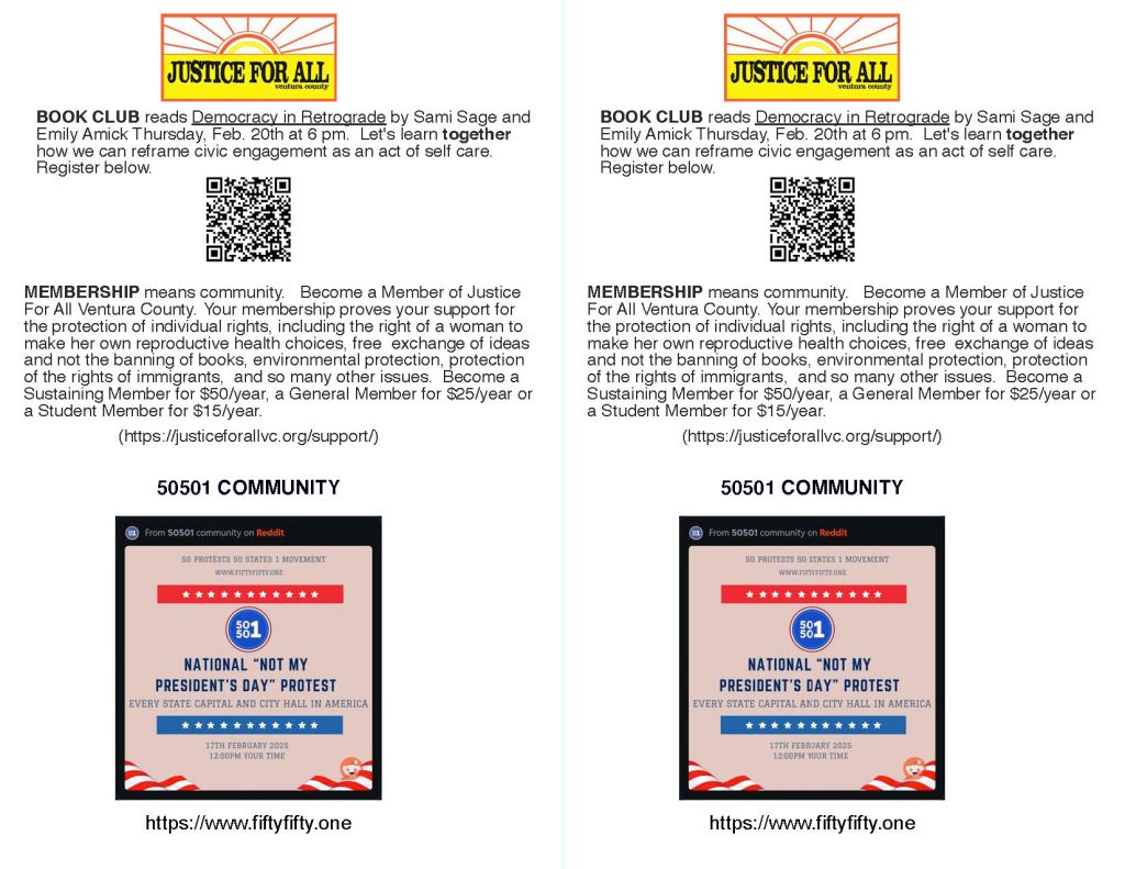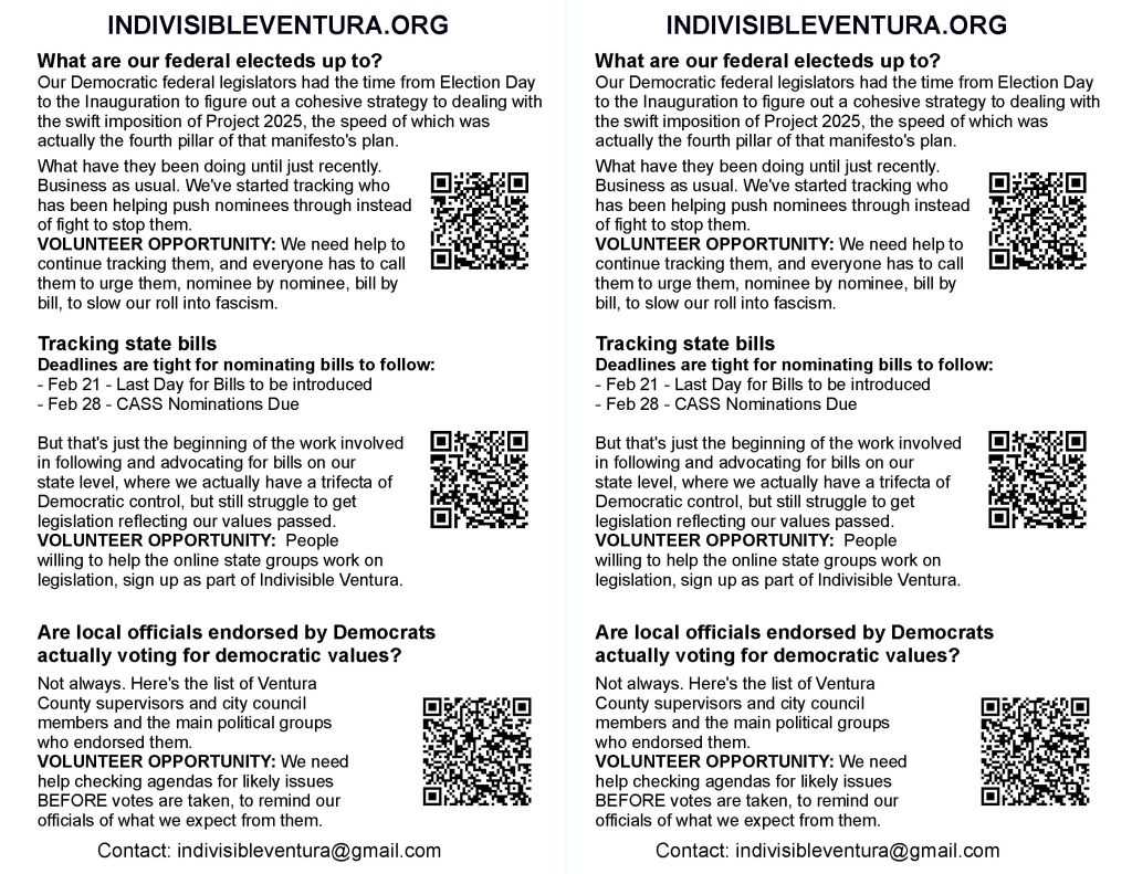 - Local Sierra Club leader Jim Hines wrote a letter that became part of both our last newsletter and and an online action: (https://indivisibleventura.org/2025/03/09/americas-crown-jewels-arent-locked-in-a-tower-part-1/)