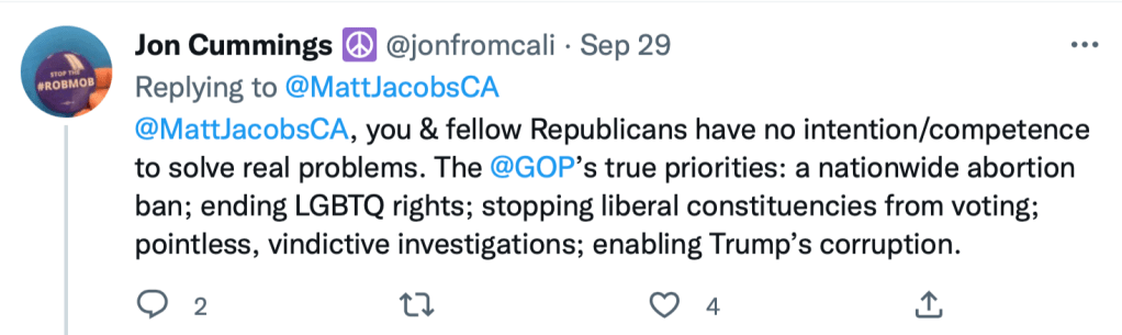 You can only use the “fighter pilot” analogy for so long, when you’re afraid to answer a question. GOP opponent Mike Garcia is one of three CA GOP congressmembers who now don’t answer questions about their forced-birther views that endanger women’s reproductive freedom and health care.