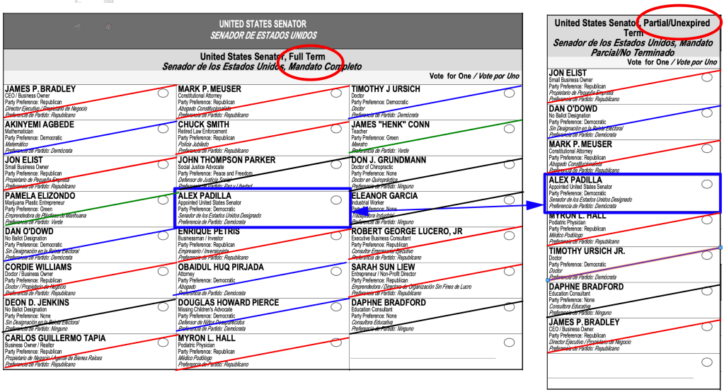 - “Full Term” – to elect a candidate (Alex Padilla) for a full 6-years.