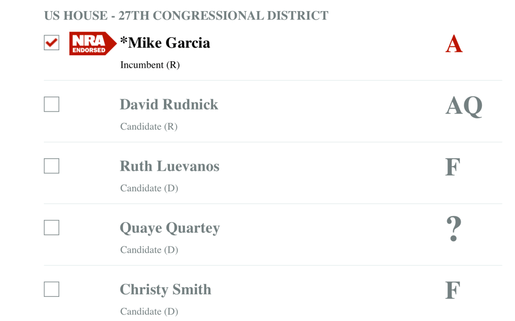 UPDATE: In light of the recent massacres, we’re going to share the NRA’s endorsement for this seat. What we’re looking for in a viable candidate is an “F” from these guys.