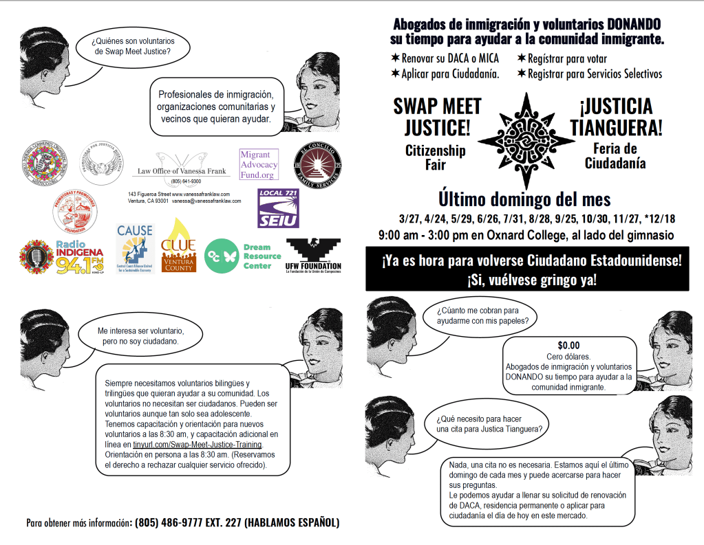 Swap Meet Justice is a last-Sunday-of-the-month citizenship fair at the Oxnard College Marketplace from 9:00-3:00pm. As the graphic above indicates, we are often joined by awesome immigrant-serving community resources as well.