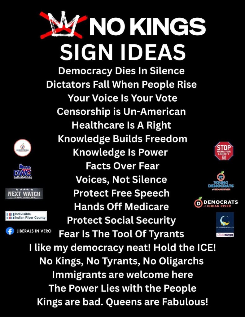 You can download signs from the NO KINGS campaign here and print them at home or take them to a local printer. Want to make your own signs? Try out these messages: