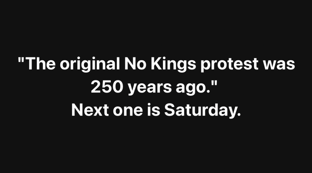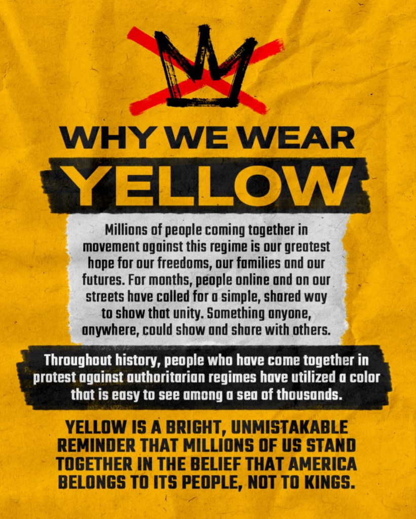 👑 We are united against kings: President Trump has openly said he wants a third term and is already acting like a monarch—seizing control of D.C., threatening other cities, and using federal forces against his own people. But the American people don’t bow to kings. Together, we will peacefully mobilize, yet again, in huge numbers to reject this corruption and abuse of power—it’s in our DNA as a country.